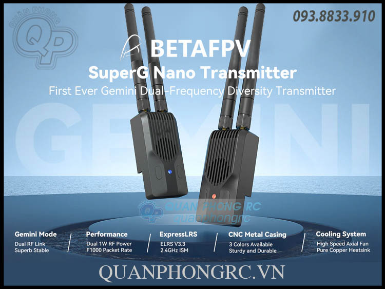 Dựa trên ELRS V3.3 và được phát triển hợp tác cùng đội ngũ developer ELRS, bộ phát Gemini Dual-Frequency Diversity đầu tiên trên thế giới đã ra đời! Hiện tại, SuperG Nano Transmitter có thể được kích hoạt hoàn toàn để đạt chất lượng link tốt nhất khi kết hợp với các RX diversity như SuperD receiver hoặc SuperP receiver. Với 2 kênh phát công suất 1W, nó vượt trội về khả năng chống nhiễu và độ ổn định, là giải pháp lý tưởng cho các ứng dụng yêu cầu cao như đua FPV, bay tầm xa và quay phim chuyên nghiệp.