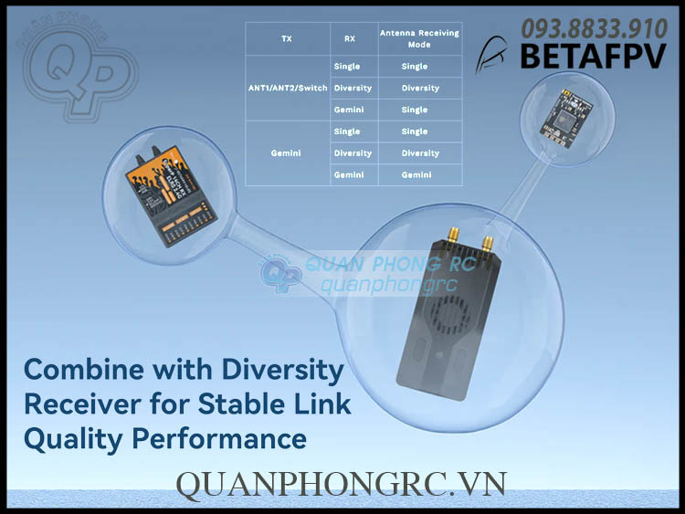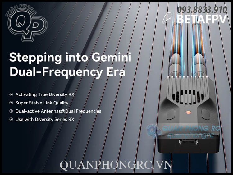 Chế độ Gemini: hai anten đồng thời nhận telemetry với độ lệch tần số 40MHz. Chúng cũng phát dữ liệu đồng thời nhưng ở hai tần khác nhau. Điều này cho phép nhận cùng một gói dữ liệu trên hai tần số và hai anten khác nhau, mang lại chuyến bay ổn định ngay cả trong môi trường nhiễu sóng phức tạp.