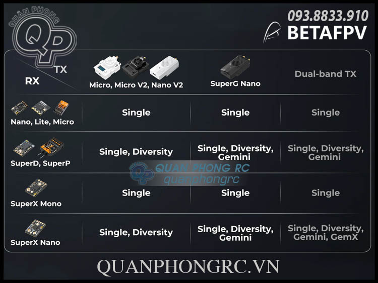 Tương thích với các module TX: Micro / Micro V2 / Nano V2 / SuperG