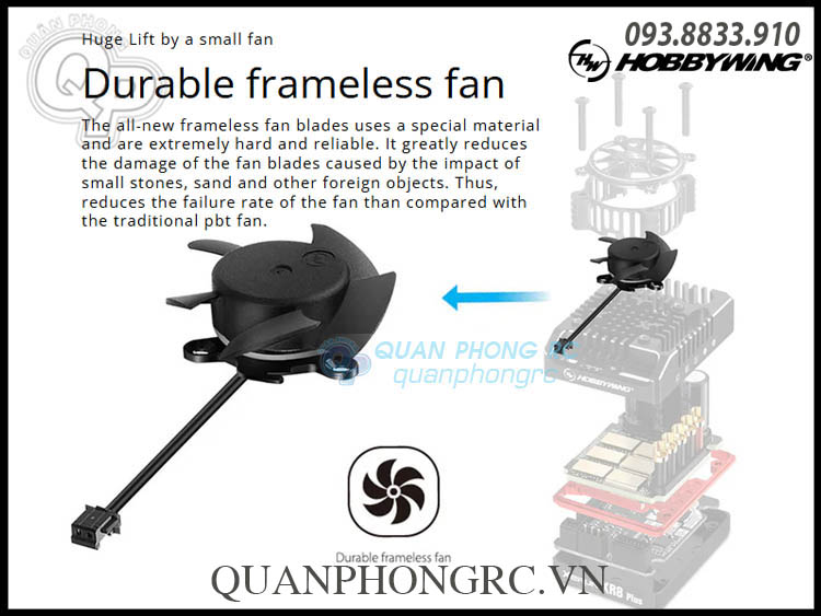 This is Hobbywing XERUN XR8 PLUS G2S 200A Sensored Brushless ESC Black For 1/8 RC Car. The frameless fan design is a patented technology. The rapid transmission of internal heat to the integrated housingradiator are made up of high airflow from the side of the fan and a copper thermal conduction sink on the internal power plate. These are built into high-reliability thermal systems to ensure that it is always in good thermal condition.