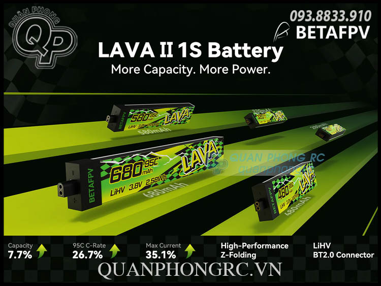 Hãy trải nghiệm bước nhảy vọt thế hệ về sức mạnh và hiệu năng với pin LAVA II 1S. Thế hệ pin mới này được nâng cấp vật liệu lõi tiên tiến, giúp tăng 5.5%–7.7% dung lượng và đạt dòng xả lên tới 95C, mang lại mức tăng dòng điện ấn tượng 27.9%–35.1%, cho khả năng cấp nguồn cực kỳ mạnh mẽ, nhạy và ổn định.
