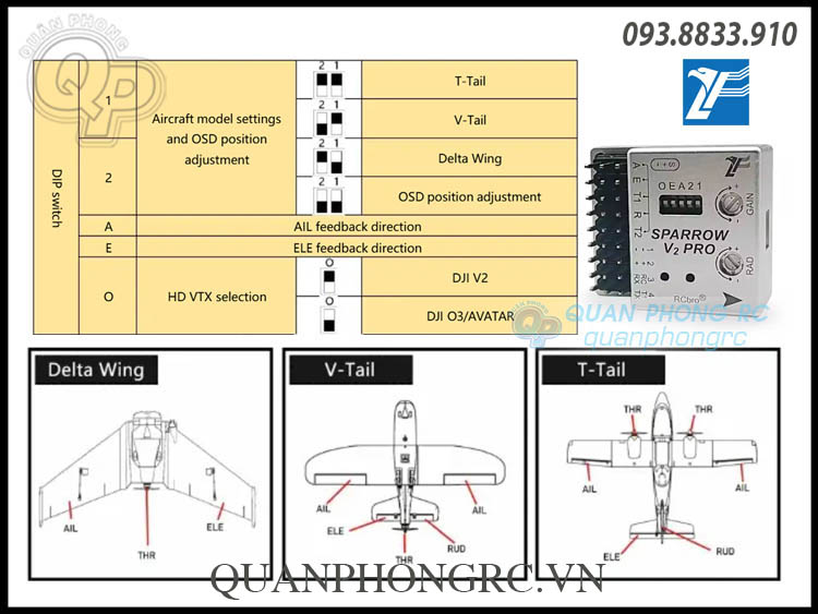 Cấu hình nhiều kiểu cánh: công tắc DIP cho phép chọn nhanh cánh thường, V-tail, Delta wing.