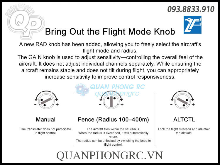 Điều chỉnh độ nhạy: núm GAIN giúp tinh chỉnh độ nhạy điều khiển bay.